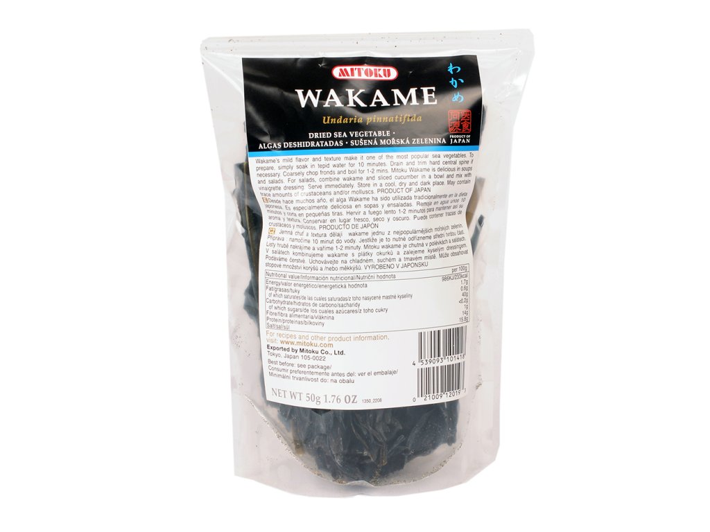 Wakame jsou mořské řasy s vysokým obsahem minerálních látek, vitamínů, bílkovin a vlákniny. Mořské řasy všeobecně jsou zázračná potravina. Obsahují více vitamínů a minerálů než jakákoliv jiná potravina na planetě. Jsou jedním z nejbohatších zdrojů bílkovin a obsahují celé spektrum karotenů, enzymů, aminokyselin, vlákniny a oktakosanolu. Minerály obsažené v mořské zelenině jsou zastoupeny ve stejných poměrech jako minerály, které se nachází v krvi. Jsou bohaté obzvláště na vápník, fosfor, hořčík, železo, jód, zinek a další stopové minerály. Mořské řasy jsou bohaté na vitamíny A,B,C,E a dokonce na vitamín B12. Jsou téměř jediným rostlinným zdrojem vitamínu B12 a obsahují 10 - 20x více minerálů než suchozemské rostliny. Mají protizánětlivé, antimikrobiální a protiplísňové účinky. Doporučená denní dávka jódu je 1g.
