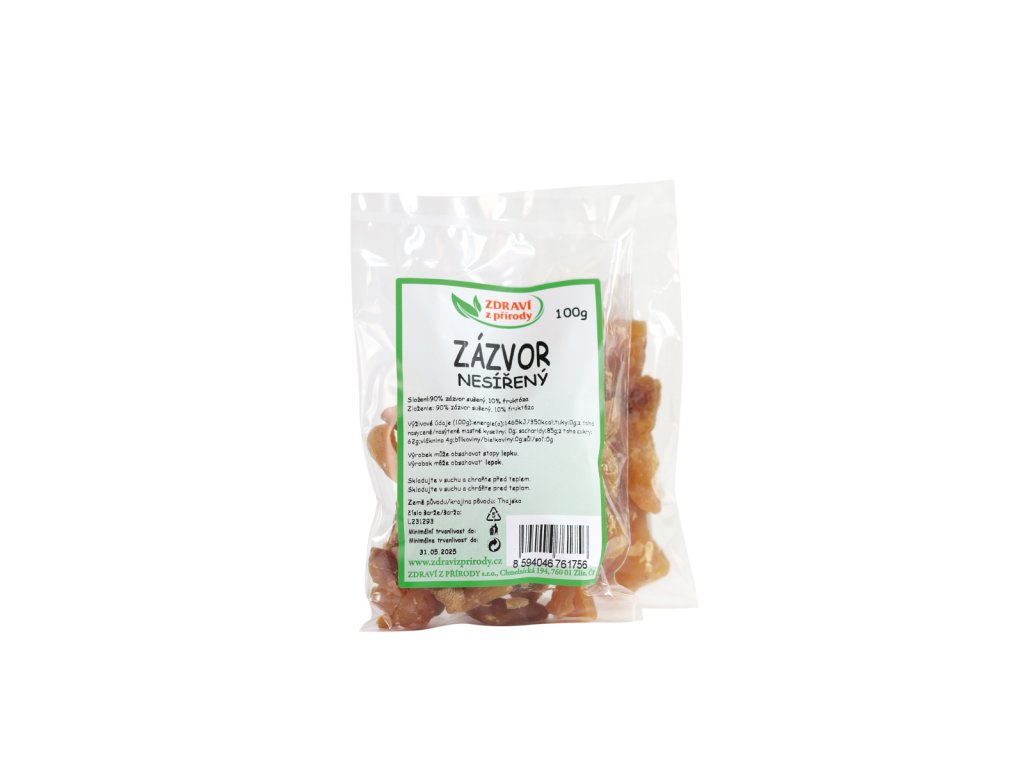 Zázvor nesířený jsou sušené kousky oddenku zázvoru. Zázvor je výbornou variantou originálního rychlého občerstvení, pro rychlé a praktické zahřátí, při pohoštění, chuti na něco výjimečného nebo ve studené kuchyni pro přípravu a dekoraci dezertů. Spojení sladké a štiplavé chuti dokáže osvěžit a příjemně a přirozeně zahřát.